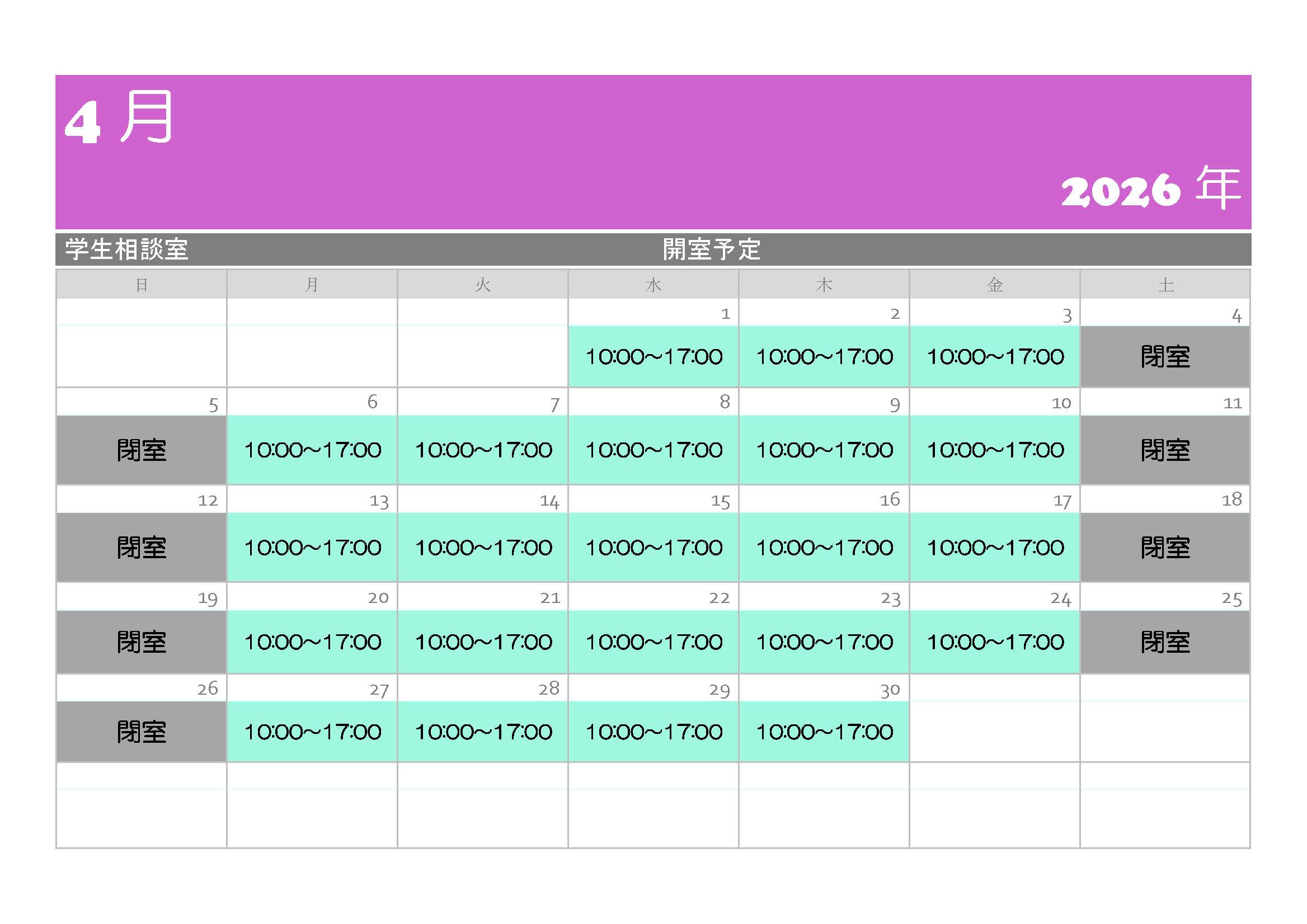 2026年4月の開室スケジュール