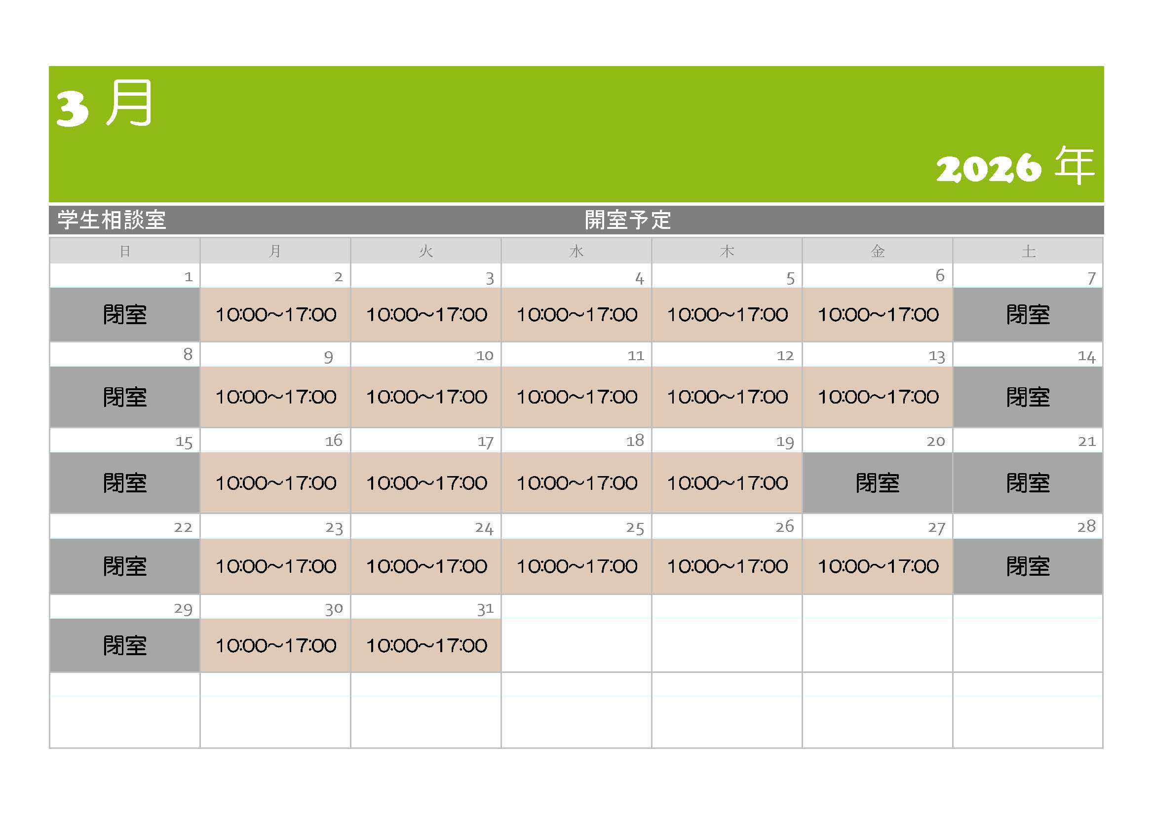 2026年3月の開室スケジュール