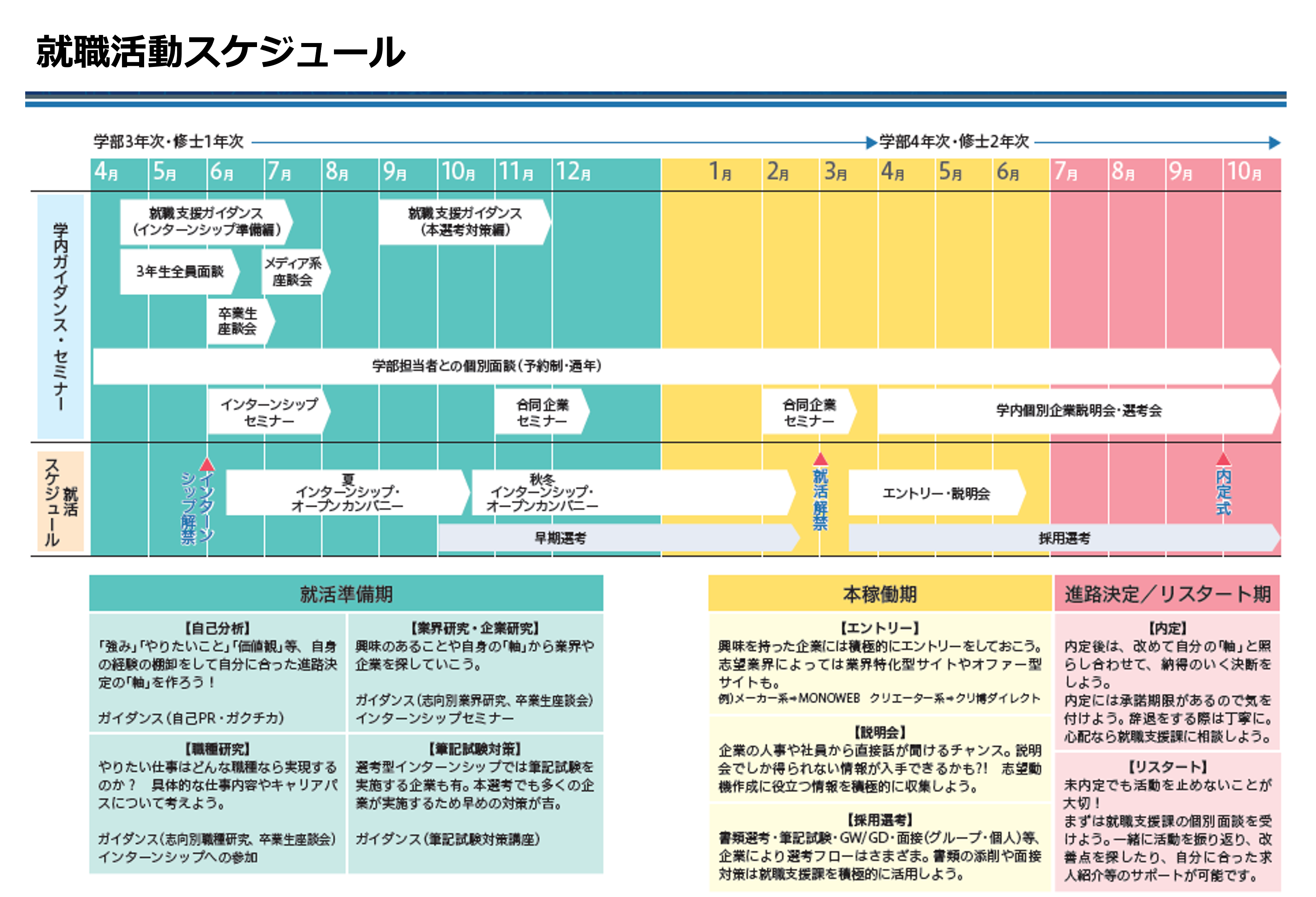 また、職員は日々大学を訪れる企業の人事担当者とも面談をしているため、最新の求人情報や選考情報、企業が欲しい人物像についての情報を持っています。その為、面談で伺ったみなさんの志向や人柄をもとに、求人を紹介したり、選考のフォローをしたりして就職活動のサポートもしています。就職活動で迷ったり、行き詰ったりしたときは気軽に就職支援課に相談に来てください。また、低学年の方の利用もお待ちしています。